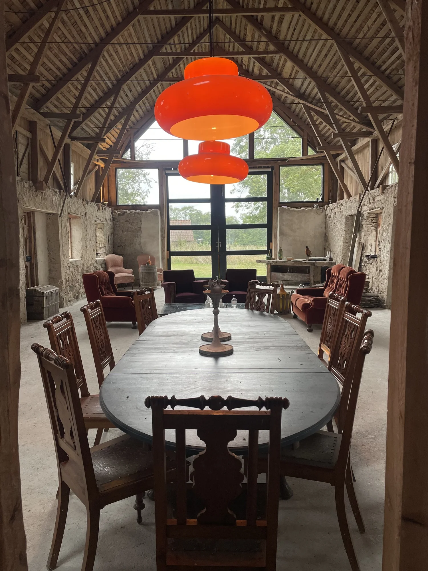 Ladugardsstommens ursprungliga karaktar bevarad -- hog takhojd, raw kalkstensvagg, naturligt ljus.